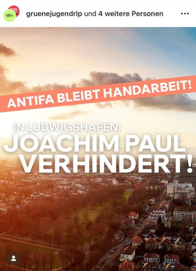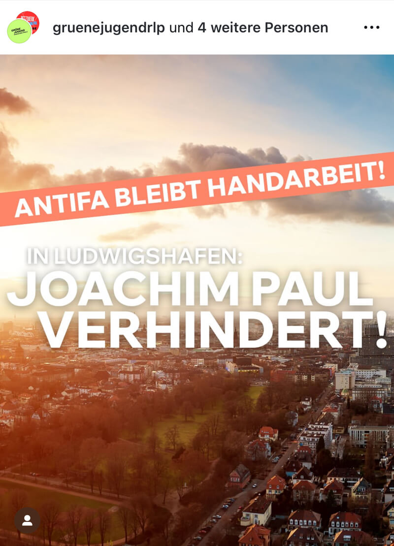 Die Grüne Jugend in Rheinland-Pfalz postete gemeinsam mit dem Netzwerk die linksextreme Parole: „Antifa bleibt Handarbeit! In Ludwigshafen Joachim Paul verhindert!“ Der grüne Bundestagsabgeordnete Julian Joswig frohlockte daraufhin: „Ein Erfolg für die Zivilgesellschaft vor Ort!“ So hatte das „Netzwerk gegen Joachim Paul“ am 5. August, dem Tag der Entscheidung des Ausschlusses, auch zu einer Demonstration vor dem Wahlausschuss aufgerufen.