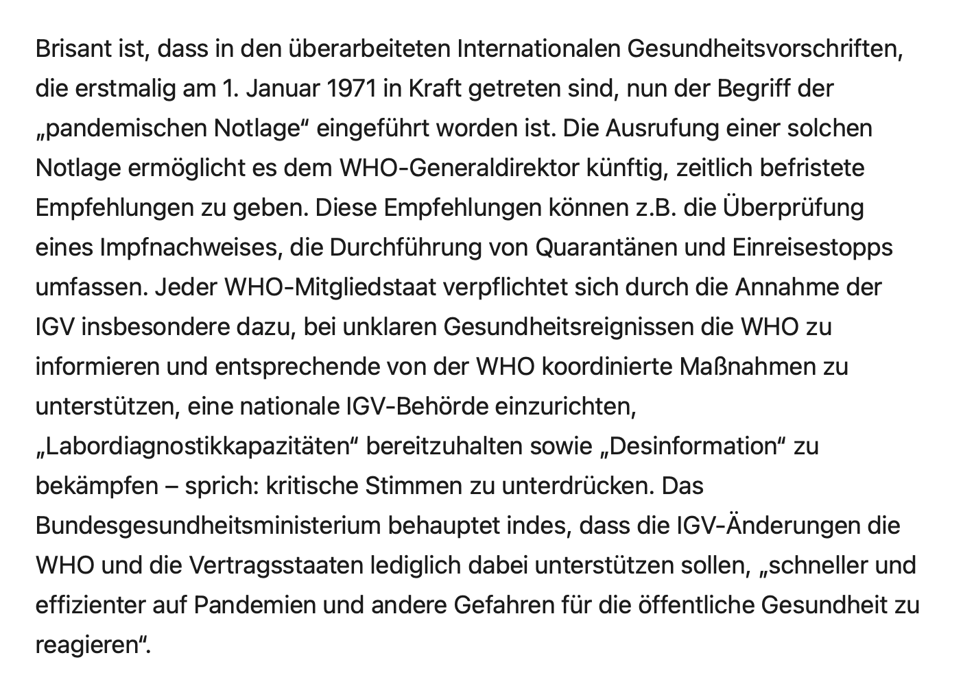 Das Bundesgesundheitsministerium betont, die Änderungen sollen helfen, schneller und effizienter auf Gesundheitsgefahren zu reagieren, und die staatliche Souveränität bleibe unberührt. Kritiker wie die Journalistin Martina Binnig warnen dagegen vor einem faktischen Durchgriffsrecht der WHO – inklusive der Möglichkeit, Ausnahmezustände in Deutschland zu bestimmen.