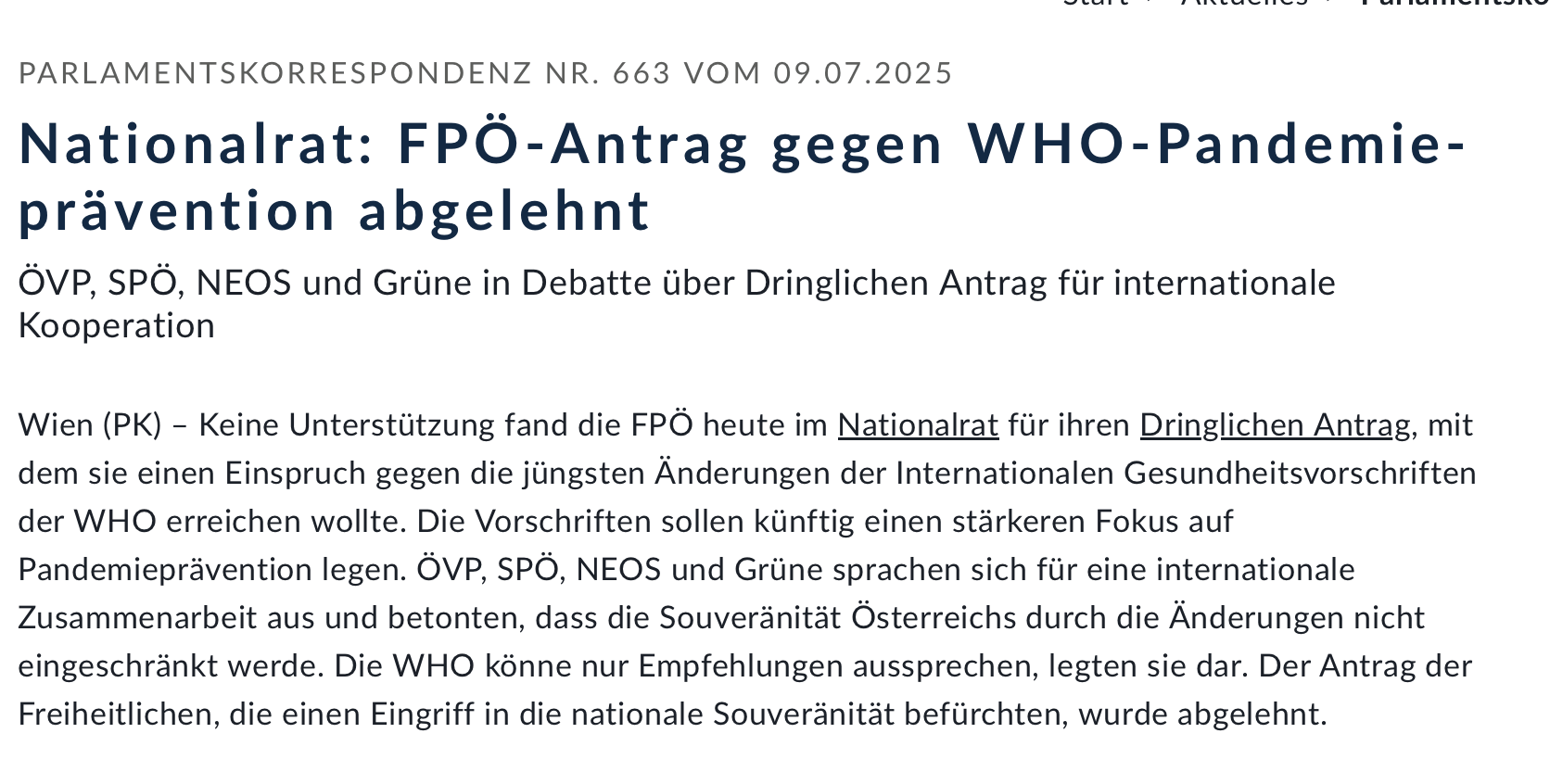 Der Dringlicher Antrag der FPÖ wurde zwar abgelehnt, aber “Um völkerrechts- und verfassungskonform zu handeln, wurde am 17.7. durch die Ständige Vertretung Österreichs bei den Vereinten Nationen in Genf ein rechtswahrender Einspruch in Bezug auf die gezielten Änderungen eingebracht.”- hieß es in einer OTS vom 18.7.2025 des Bundesministerium für Arbeit, Soziales, Gesundheit, Pflege und