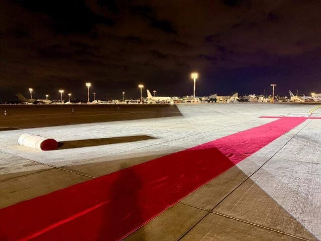 Der rote Teppich für Trump wurde am Ben-Gurion-Flughafen bereits ausgerollt. Der US-Präsident will bei einem Kurzbesuch im Nahen Osten am Montag die Waffenruhe zwischen Israel und der Hamas im Gaza-Krieg feiern und auf weitere Schritte zum Frieden hinwirken.