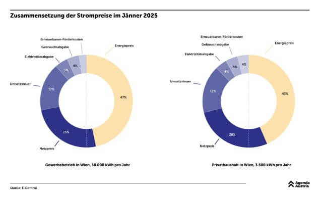 Der Ökonom Jan Kluge von der Agenda Austria bringt es auf X knapp auf den Punkt: „Wir vollbringen das Kunststück, dass der Strompreis zum überwiegenden Teil aus Steuern, Abgaben und Netzgebühren besteht.” Nicht vergessen darf man laut der Agenda, dass die Erzeuger auch noch Energiekrisenbeitrag, Körperschafts-, Übergewinn-, Kommunal- und Grundsteuer zahlen. „Das letzte, was wir brauchen, ist noch eine Steuer.”