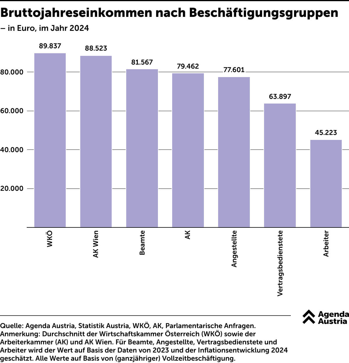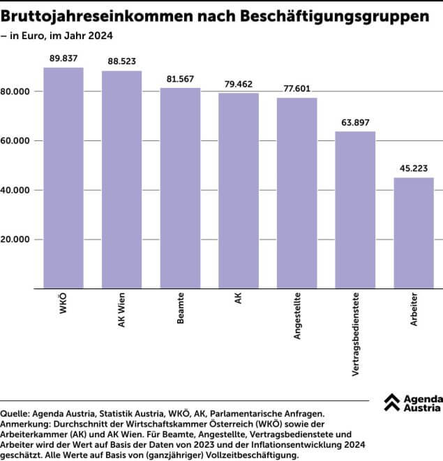 Während Metallarbeiter angesichts der Lage Reallohnverluste akzeptieren, kennt die Kammer keine Krise: Sie darf mit Einnahmen von rund 1,3 Milliarden Euro rechnen, die Rücklagen belaufen sich auf über zwei Milliarden Euro. Möglich machen das die Zwangsbeiträge. Wie die Denkfabrik Agenda Austria überdies aufzeigt, liegt die Wirtschaftskammer Österreich in der Gehaltstabelle liegt ganz vorne: Ein Vollzeit-Mitarbeiter in der Wirtschaftskammer verdient im Schnitt fast 90.000 Euro brutto im Jahr – etwas mehr als ein Beschäftigter in der Arbeiterkammer Wien. Doch auch dort wird nicht geknausert: Gut 14 Prozent liegt man dort über dem durchschnittlichen Angestellten – und damit fast beim Doppelten eines Arbeiters.