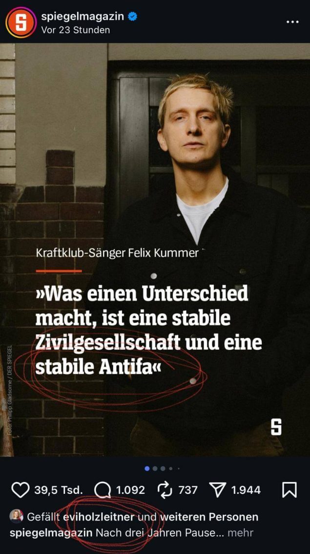 Kraftklub-Sänger Felix Kummer sagte gegenüber dem Spiegel: „Was einen Unterschied macht, ist eine stabile Zivilgesellschaft und eine stabile Antifa.“ Dieses Zitat wurde öffentlich geteilt – und gefällt der österreichischen Ministerin für Frauen, Wissenschaft und Forschung, Eva-Maria Holzleitner.