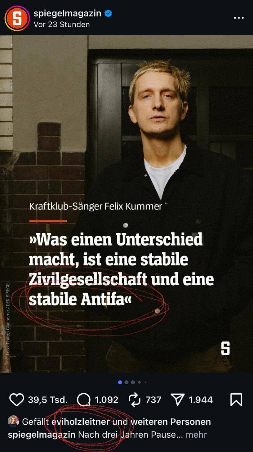 Eva-Maria Holzleitner hat auf ihrem öffentlichen Profil den Instagram-Post zum Spiegel-Interview mit Kraftklub-Sänger Felix Kummer mit einem „Gefällt mir“ versehen.