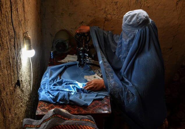 Afghanische Frau arbeitet zu Hause im Verborgenen, vollverschleiert. Der Ausschluss von Bildung und Beruf gilt laut EuGH als Asylgrund.APA/AFP/Atif ARYAN