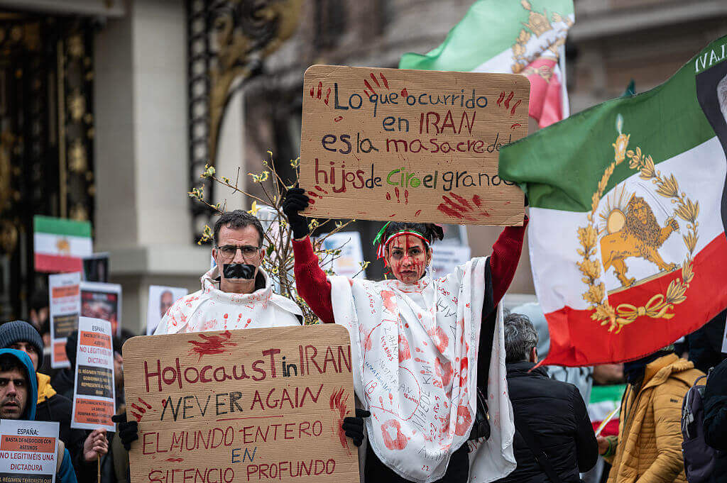 Demonstranten, mit Kunstblut bedeckt, halten Plakate während eines Protests. In Madrid lebende Iraner versammelten sich vor dem spanischen Parlament, um zu fordern, dass die Islamischen Revolutionsgarden (IRGC) auf die Liste terroristischer Organisationen gesetzt werden, und um gegen die islamistische Theokratie zu protestieren sowie ein Ende der Repression zu verlangen.GETTYIMAGES/Marcos del Mazo