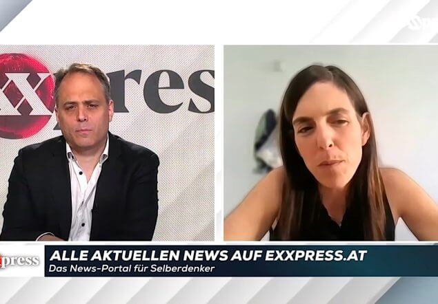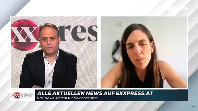 Klartext zum Völkerrecht: Die israelische Juristin Yifa Segal (r.) im Gespräch mit exxpress-Redakteur Stefan Beig (l.) über humanitäre Hilfe, Hamas und die Rolle der UNO.EXXPRESSTV/EXXPRESSTV