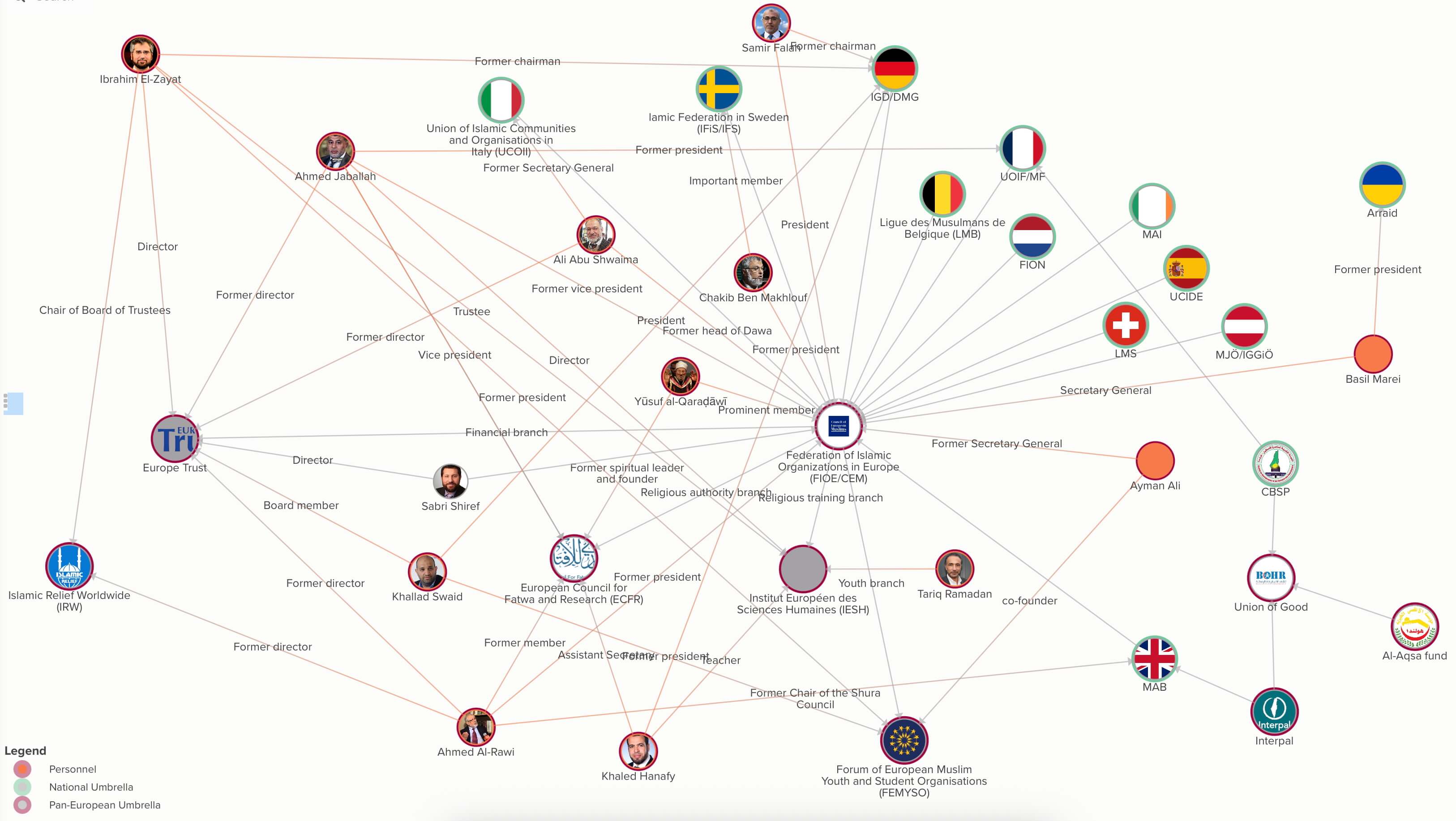 Eine zweite Ebene läuft über Religion und Ausbildung. Der Europäische Fatwa-Rat (ECFR) erstellt religiöse Rechtsgutachten für Muslime in Europa, während das Europäische Institut für Humanwissenschaften (IESH) Imame und Funktionäre ausbildet.