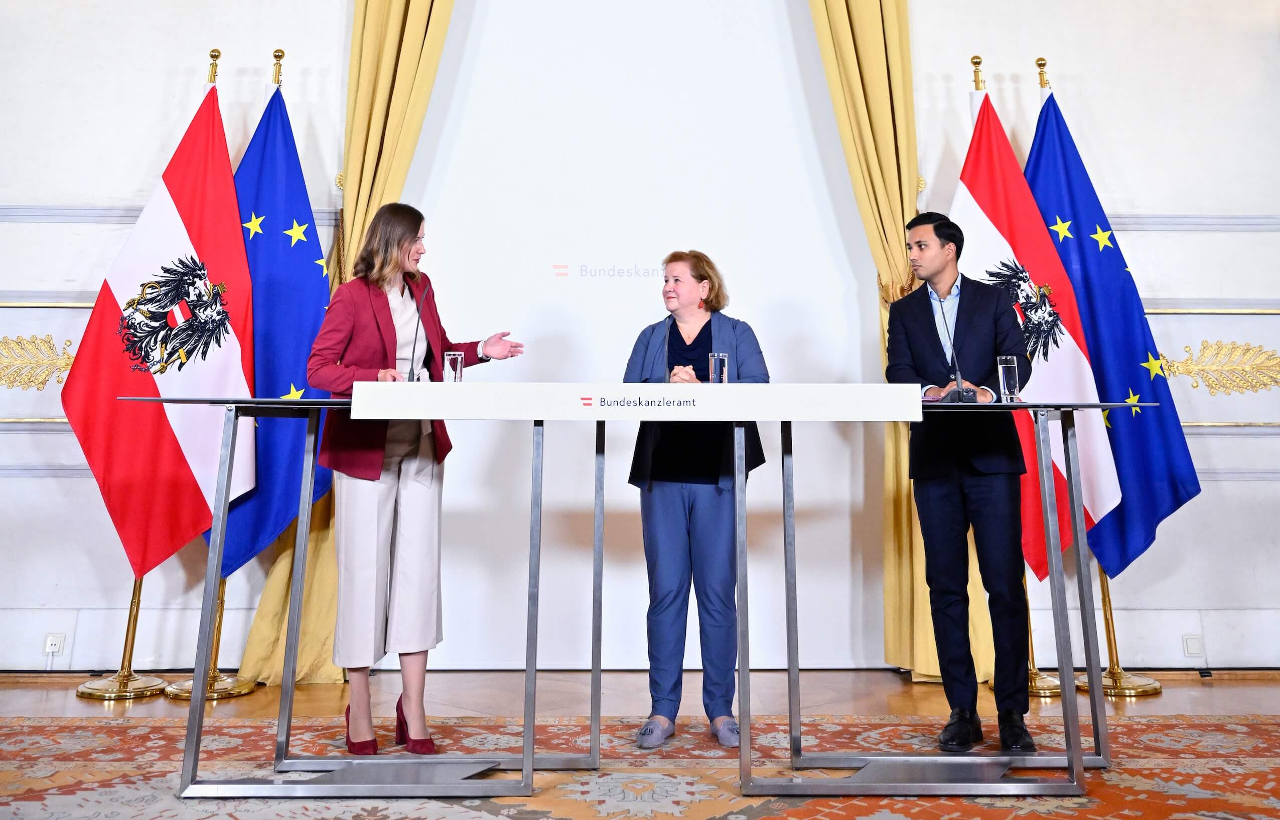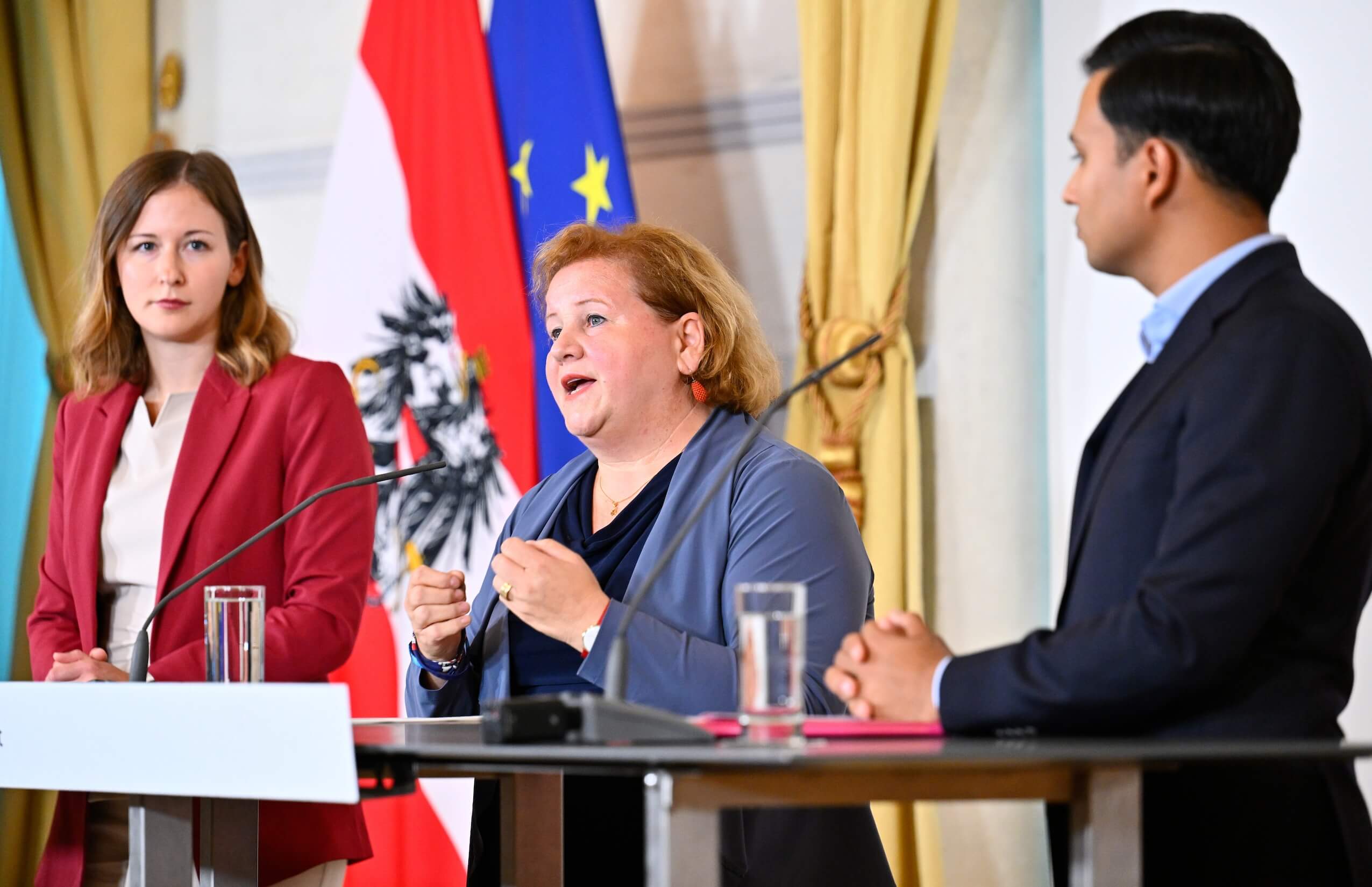 Integrationsministerin Claudia Plakolm (ÖVP), Sozialministerin Korinna Schumann (SPÖ) und NEOS-Klubobmann Yannick Shetty (v.l.n.r.) sind sich uneins: Eigentlich hätte nur Asylberechtigte die Integrationsphase absolvieren müssen.APA/HANS KLAUS TECHT