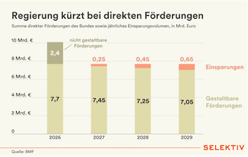 Die Bundesregierung plant deutliche Einschnitte bei direkten Förderungen. Laut dem ersten Bericht der eingesetzten „Förder-Taskforce“ sollen bis 2029 rund 1,95 Milliarden Euro eingespart werden. Grundlage der Berechnungen ist ein sogenanntes „gestaltbares Fördervolumen“ von rund 7,7 Milliarden Euro.
