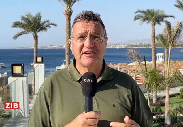 Karim El-Gawhary (Bild) dreht sogar eine Ansprache für Frieden und Wohlstand im Nahen Osten zu einer Brandrede gegen Gaza um.ORF/ZiB 8:00/Screenshot