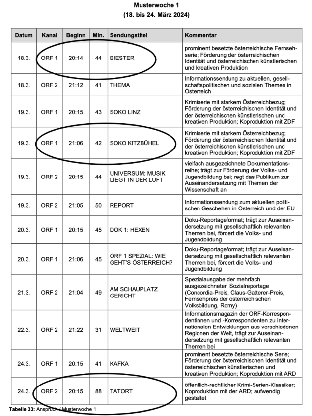 Doch was macht der ORF aus dieser Bestimmung? Teil der Aufgaben des ORF ist auch die Abgabe eines Jahresberichts, in dem der öffentlich-rechtliche Sender über seine Geschäftstätigkeit berichtet. Und dort schreibt der ORF auch über seine „anspruchsvollen Sendungen“ anhand einer „Musterwoche“. So sind etwa die eigens produzierte Soap-Opera „Biester“ und die Krimiserien „Soko Kitzbühel“ und „Soko Linz“ laut ORF „anspruchsvoll“. Auch der „Tatort“ befindet sich in der Liste.