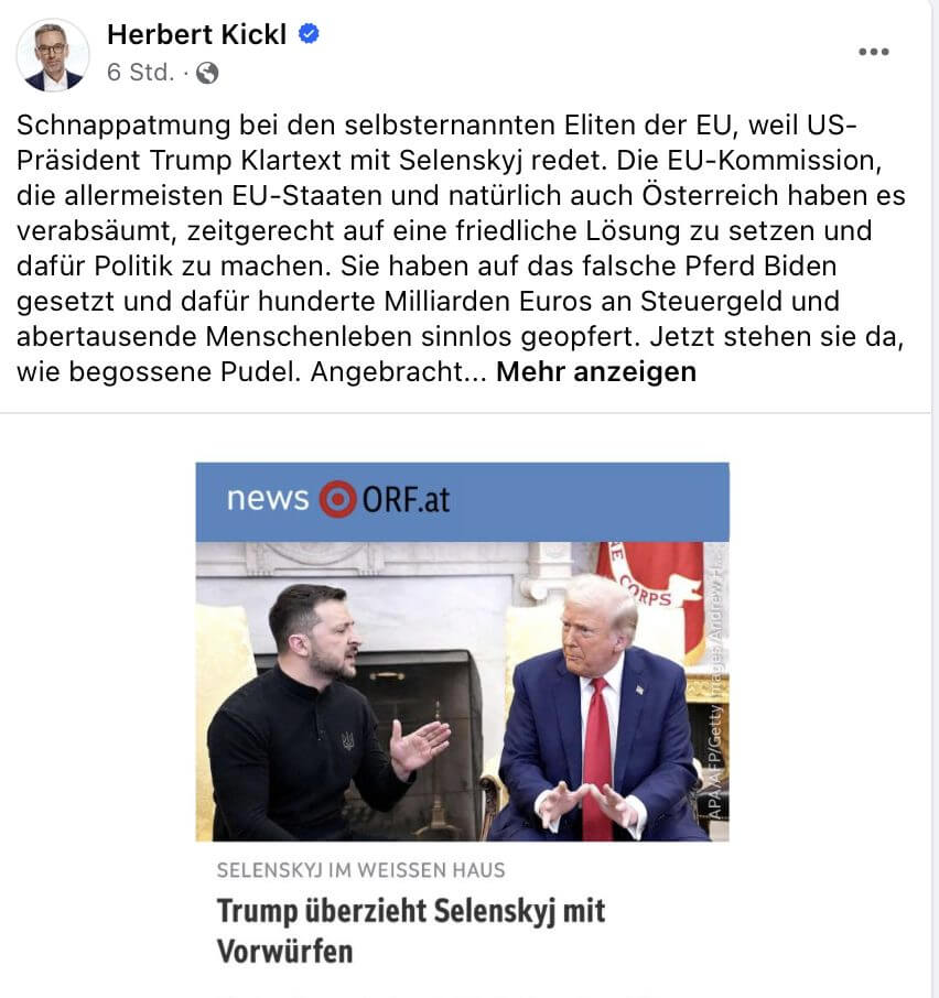 Nun kommentiert auch der freiheitliche Parteiobmann Herbert Kickl den Vorfall – und spart nicht mit Spott. „Schnappatmung bei den selbsternannten Eliten der EU, weil US-Präsident Trump Klartext mit Selenskyj redet”, so Kickl am Samstag auf Facebook. „Die EU-Kommission, die allermeisten EU-Staaten und natürlich auch Österreich haben es verabsäumt, zeitgerecht auf eine friedliche Lösung zu setzen und dafür Politik zu machen”, kritisiert Kickl.