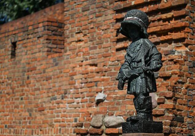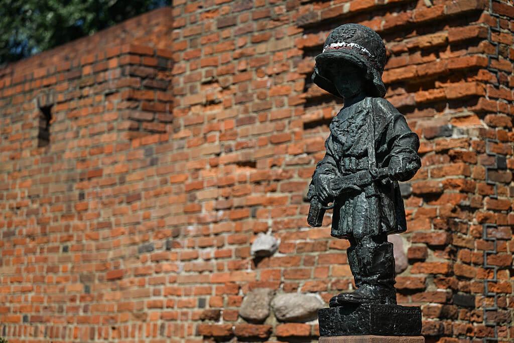 Das Denkmal des kleinen Aufständischen (Pomnik Malego Powstanca) zum Gedenken an die Kindersoldaten des Warschauer Aufstands von 1944, gesehen entlang der Verteidigungsmauern der Warschauer Altstadt, in Warschau, Polen, am 15. August 2025.GETTYIMAGES/NurPhoto