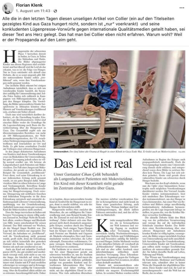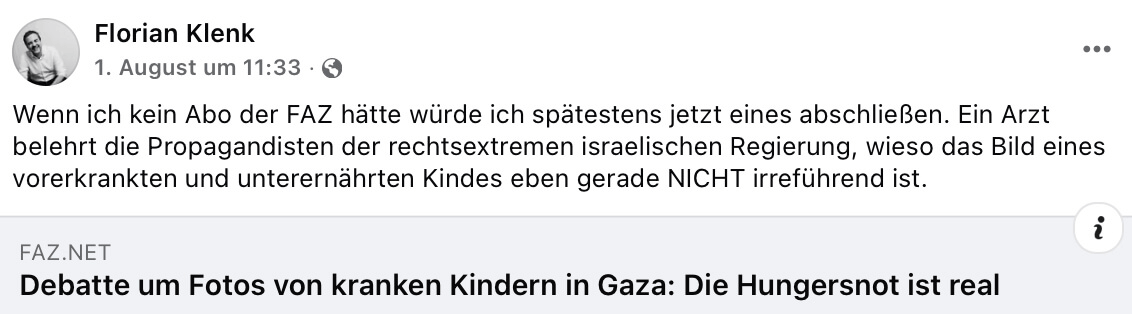 Was Klenk von Kritikern der Fake News hält, macht er in einem weiteren Posting klar: „Ein Arzt belehrt die Propagandisten der rechtsextremen israelischen Regierung, wieso das Bild eines vorerkrankten und unterernährten Kindes eben gerade NICHT irreführend ist.“