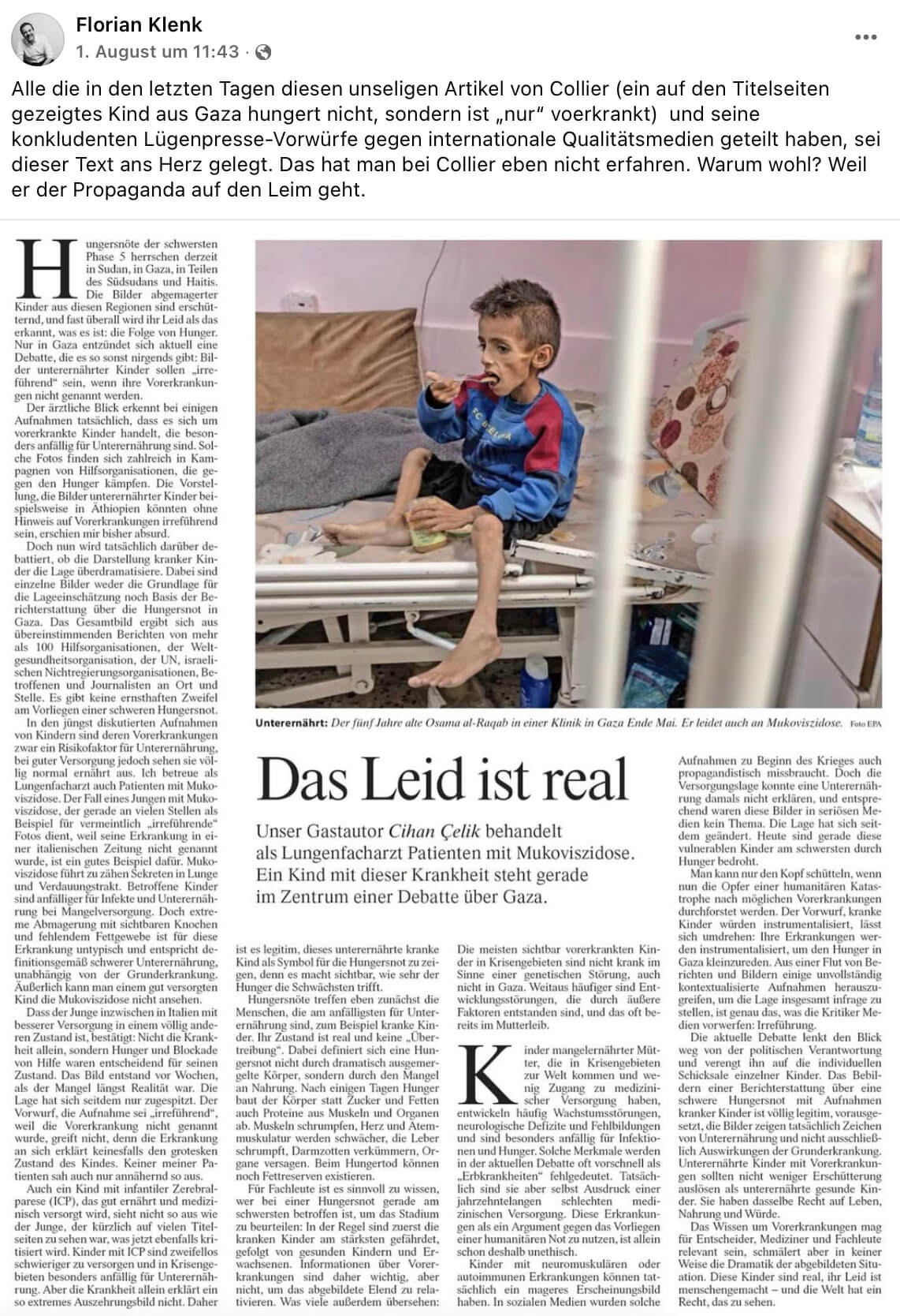 Auch der von Florian Klenk ins Spiel gebrachte FAZ-Gastbeitrag ist bei genauerem Hinsehen problematisch. Verfasst wurde er vom Lungenfacharzt Cihan Çelik, Oberarzt am Klinikum Darmstadt. Auf den ersten Blick wirkt der Text differenziert – tatsächlich übernimmt Çelik weitgehend die Deutung Hamas-naher NGOs und stützt ein Narrativ, das medizinisch wie journalistisch weniger fundiert ist, als es den Anschein erweckt.