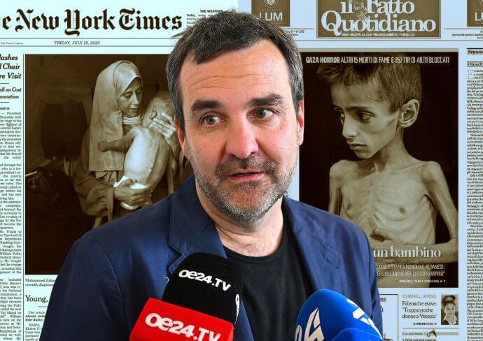 Nicht verhungert – aber medial missbraucht? Falter-Chef Klenk verteidigt (Bild) umstrittene Bilder, die schwerkranke Kinder als Symbol für Israels angebliche Aushungerungspolitik zeigen. Im Hintergrund: NYT und Il Fatto.APA/HELMUT FOHRINGER/NYT/Il Fatto/Screenshot