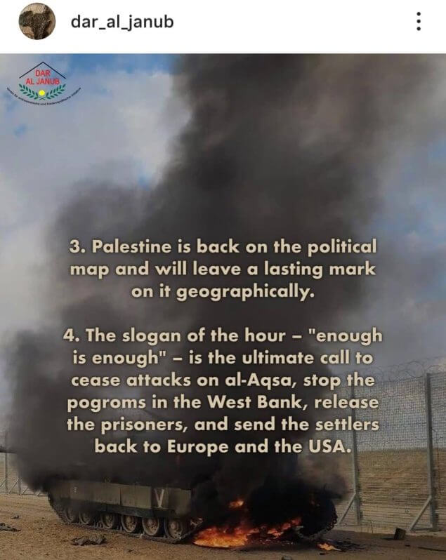 Konsequenterweise wehrt sich Dar al Janub gegen eine „Kriminalisierung” des auf Palästina-Demos hierzulande oft gehörten und gesehenen Hamas-Slogans „From the river to the sea, Palestine will be free!“, der Israel indirekt das Existenzrecht abspricht und folglich als antisemitischer Code gilt.