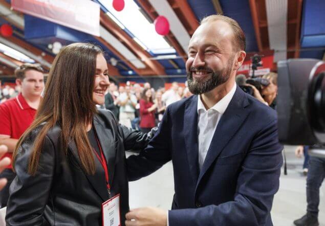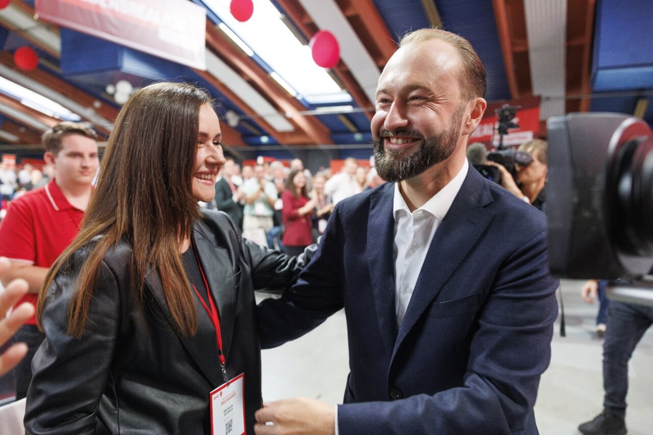Michaela Grubesa (SPÖ /links) und Landesparteiobmann Max Lercher (SPÖ) am Samstag, 20. September 2025, während des Landesparteitags der SPÖ Steiermark in Premstätten.APA/ERWIN SCHERIAU