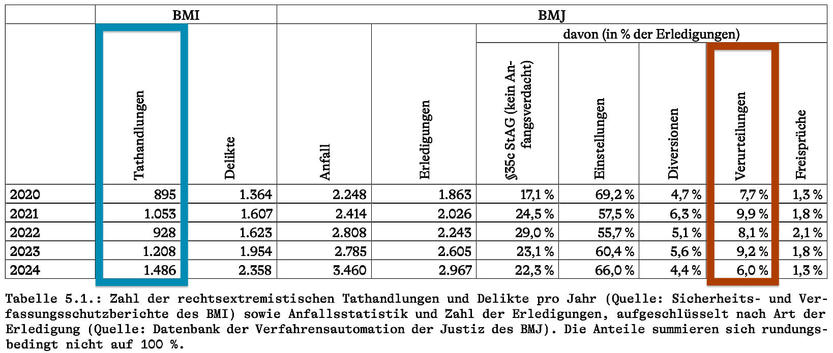 Ein entscheidender Punkt gehe in den Berichten unter, kritisiert Weber auf seinem Blog. „Die Anzahl der Verurteilungen – in Relation zu den als solche klassifizierten Tathandlungen – hat sogar abgenommen.“ Im Jahr 2023 gab es 2.605 Erledigungen, aber nur 240 Verurteilungen (9,2 Prozent). Im Folgejahr 2024 waren es 2.967 Erledigungen, aber nur 178 Verurteilungen (6,0 %).