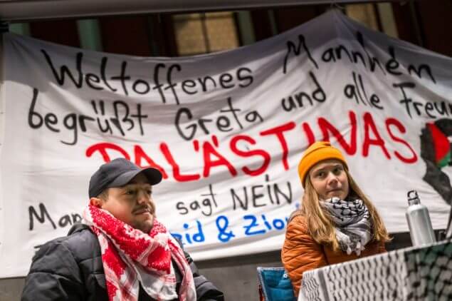 6. Dezember 2024: Bei einer Kundgebung in Mannheim rief Thunberg mit hysterischem Lachen: „Fuck Germany. Fuck Israel.“ Veranstalter war die Gruppe Zaytouna, deren Telegram-Kanal Aussagen wie „zionistische Schweine“ enthält. Mit auf der Bühne: Hasan Özbay (gegen den wegen Volksverhetzung ermittelt wird) und Hebh Jamal, die Deutschland als Komplizen eines israelischen Völkermords bezeichnete.