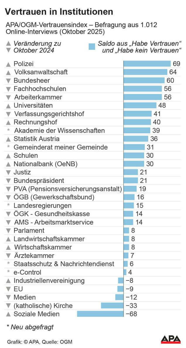 Seit Jahren ständig im Spitzenfeld des Vertrauens liegen laut Bachmayer wiederum die Arbeiterkammer, Volksanwaltschaft, Rechnungshof, Fachhochschulen und Universitäten. Über einen positiven Saldo können sich auch der Bundespräsident (plus 21), das Parlament (plus 8), die Landesregierungen (plus 15) und die Gemeinderäte (plus 31) freuen.