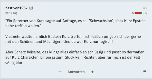 Nach der Standard-Ente kochen die Emotionen über: Ein grob fehlerhafter Artikel über ein angebliches Kurz–Epstein-Treffen bringt Österreichs „Qualitätszeitung“ in Erklärungsnot. Während der Standard zurückrudert, explodiert das hauseigene Forum – und zeigt erneut, wie hemmungslos Hetze dort durchrauscht, wenn’s gegen ÖVP oder FPÖ geht.