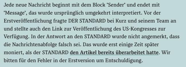 Doch statt klarer Worte und echter Transparenz scheint man beim Standard eher um Schadensbegrenzung bemüht. In einer verwirrenden Erklärung hieß es sinngemäß, man habe die Reihenfolge der Nachrichten falsch interpretiert und Kurz sei daran nicht ganz unschuldig, weil dessen Team den Fehler vor Veröffentlichung nicht selbst bemerkt habe.