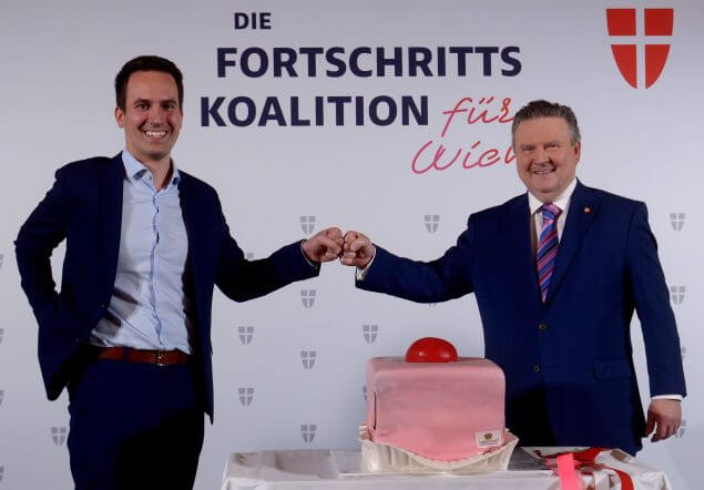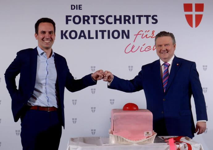 Große Gesten, große Versprechen: NEOS-Bildungsstadtrat Christoph Wiederkehr und Bürgermeister Michael Ludwig (SPÖ) beim Start der rot-pinken „Fortschrittskoalition“. Fünf Jahre später kann jedes zweite Wiener Kind beim Schuleintritt kaum Deutsch.APA/HERBERT PFARRHOFER