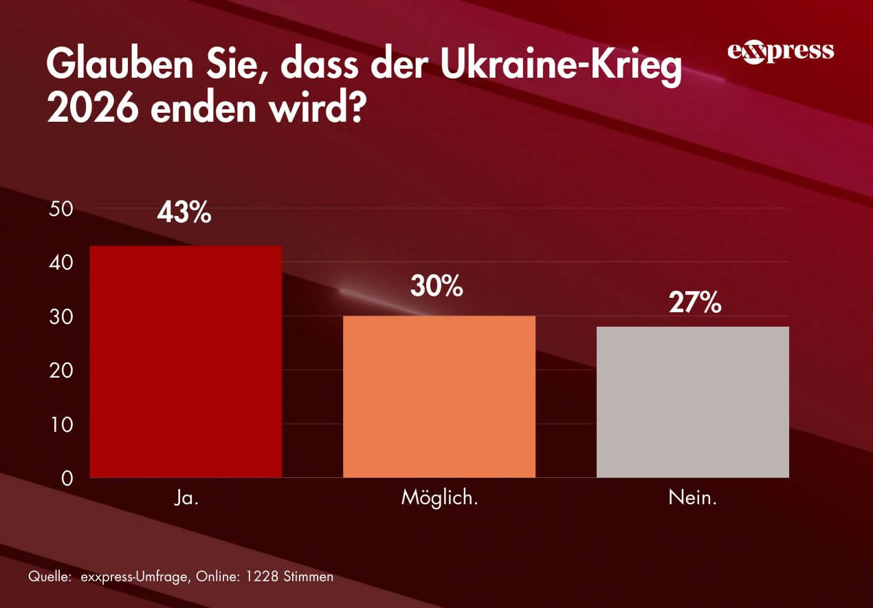 Im Rahmen unserer Live-Sendung exxpress Live wurden die Zuseher gefragt, ob sie denken, dass der Ukraine-Krieg im Jahr 2026 enden werde. Das Ergebnis zeigt ein gespaltenes Stimmungsbild mit leichter Tendenz zum Optimismus.