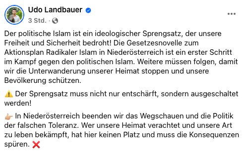 „Der Aktionsplan ist ein Schutzschild für unsere Kinder, Frauen und Familien, die in Freiheit, Sicherheit und Frieden ohne islamistische Einflussnahme leben wollen. Wir brauchen keinen importierten Kulturkampf im Klassenzimmer“, erklärt Landeshauptfrau-Stellvertreter Udo Landbauer (FPÖ).
