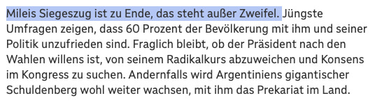 Aber das war noch nicht alles. Der letzte Absatz, am Sonntagnachmittag noch online, begann mit der apodiktischen Feststellung: „Mileis Siegeszug ist zu Ende, das steht außer Zweifel.“ Am Montag war der Satz verschwunden – offenbar selbst der Redaktion zu peinlich geworden.