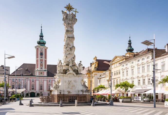 Leerer Hauptplatz in St. Pölten: Wo einst reges Treiben herrschte, bleiben heute viele Tische und Geschäfte verwaist.GETTYIMAGES/manfredxy