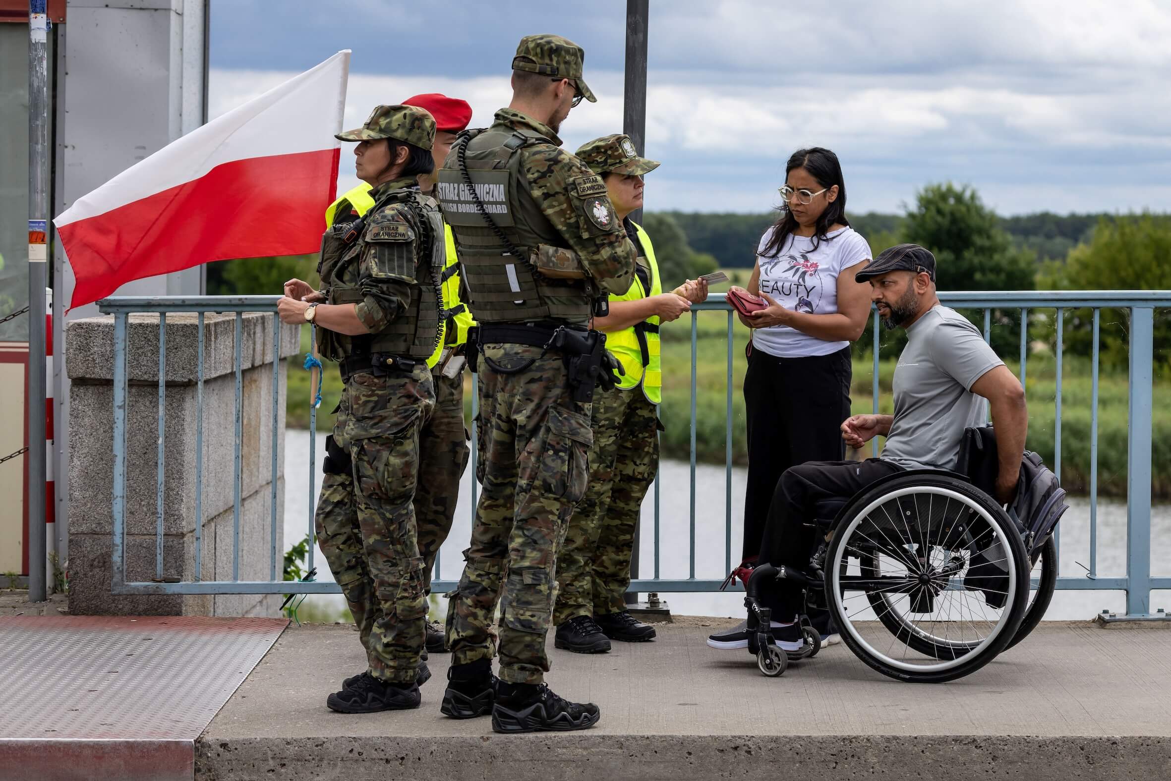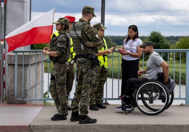Polnische Grenzsoldaten stoppen Einreisende – Kontrolle auch bei Rollstuhlfahrern.APA/AFP/Wojtek RADWANSKI