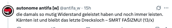 Auch die „autonome antifa” meldet sich auf X zu dem Vorfall: „Kärnten ist und bleibt das letzte Drecksloch.”