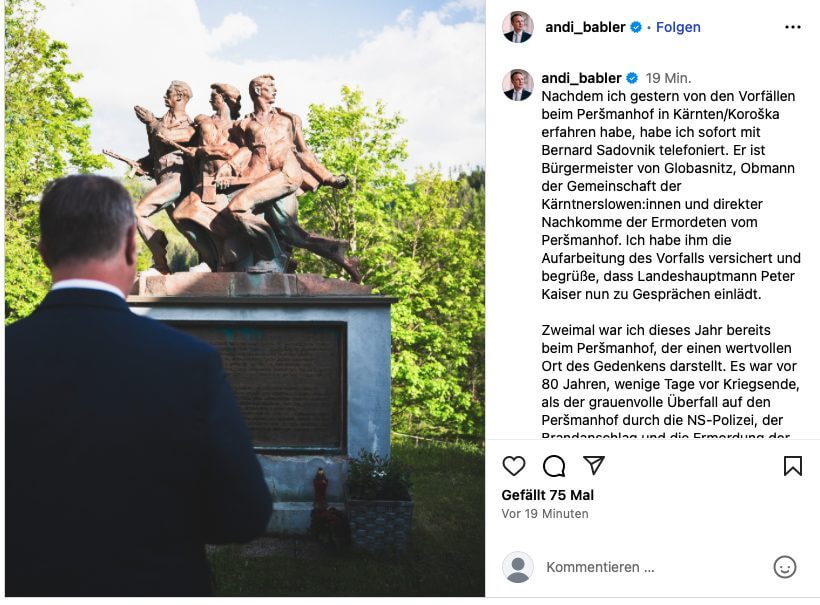Auch der Bürgermeister von Globasnitz und Obmann der Gemeinschaft der Kärntner Slowenen Bernard Sadovnik ist erschüttert und wandte sich noch am Sonntagabend an die österreichische Regierung. Vizekanzler Andreas Babler (SPÖ) hat prompt auf das Schreiben reagiert. „Nachdem ich gestern von den Vorfällen beim Peršmanhof in Kärnten/Koroška erfahren habe, habe ich sofort mit Bernard Sadovnik telefoniert. Er ist Bürgermeister von Globasnitz, Obmann der Gemeinschaft der Kärntnerslowen:innen und direkter Nachkomme der Ermordeten vom Peršmanhof. Ich habe ihm die Aufarbeitung des Vorfalls versichert und begrüße, dass Landeshauptmann Peter Kaiser nun zu Gesprächen einlädt”, so Babler am Montagnachmittag auf Instagram. „Der sensible und bedachte Umgang mit Orten des Gedenkens gehört zu unserer historischen Verantwortung. Antifaschistische (Gedenk-)Arbeit bleibt notwendig, gerade in Zeiten des europaweiten Rechtsrucks”, mahnt der Vizekanzler.