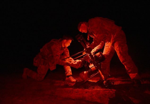 Nachtlogistik im Rotlicht: 24. Mech-Brigade belädt bei Chasiv Jar eine Magura-Nachtdrohne für einen Versorgungsflug.APA/AFP/Genya SAVILOV