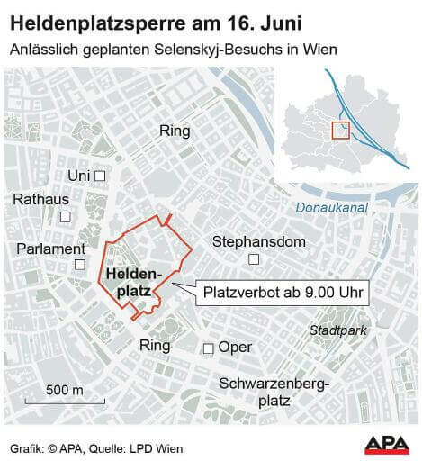 Der ukrainische Präsident Selenskyj ist am Montag in Österreich und trifft sich mit Bundespräsident Alexander Van der Bellen und Bundeskanzler Christian Stocker (ÖVP). Die Sicherheitsvorkehrungen sind dementsprechend: Auf dem Heldenplatz rund um Präsidentschaftskanzlei und Bundeskanzleramt gilt seit neun Uhr eine ganztägige Platzsperre. Konkret reicht die Sperre vom Michaelertor über die Rückseite des Burgtheaters zur Bankgasse, Wallnerstraße und bis in den Kohlmarkt hinein.