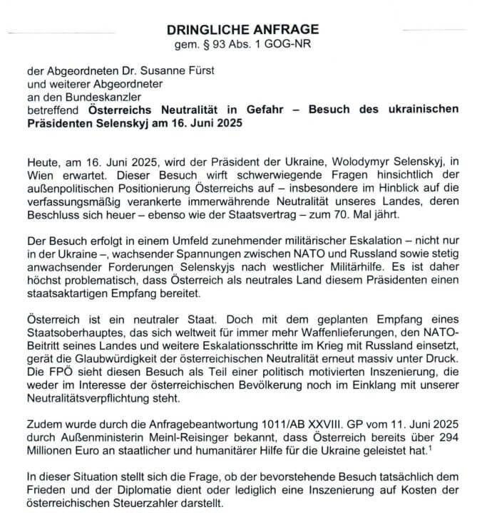 Die Dringliche Anfrage betreffend „Österreichs Neutralität in Gefahr – Besuch des ukrainischen Präsidenten Selenskyj am 16. Juni 2025“ kann auf der Webseite des Parlaments abgerufen werden.