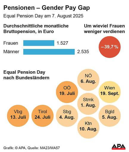39,7 Prozent beträgt der Unterschied zwischen der durchschnittlichen monatlichen Bruttopension von Frauen und Männern. Auf die hohe, aber erstmals unter 40 Prozent gefallene Lücke weist der Equal Pension Day hin, der heuer auf Donnerstag, den 7. August, fällt. Männer haben dann im Schnitt so viel Pension erhalten, wie Frauen erst am Ende des Jahres – 147 Tage später. Im Vorjahr war der Unterschied mit 40,1 Prozent noch geringfügig größer, Equal Pension Day war der 6. August.