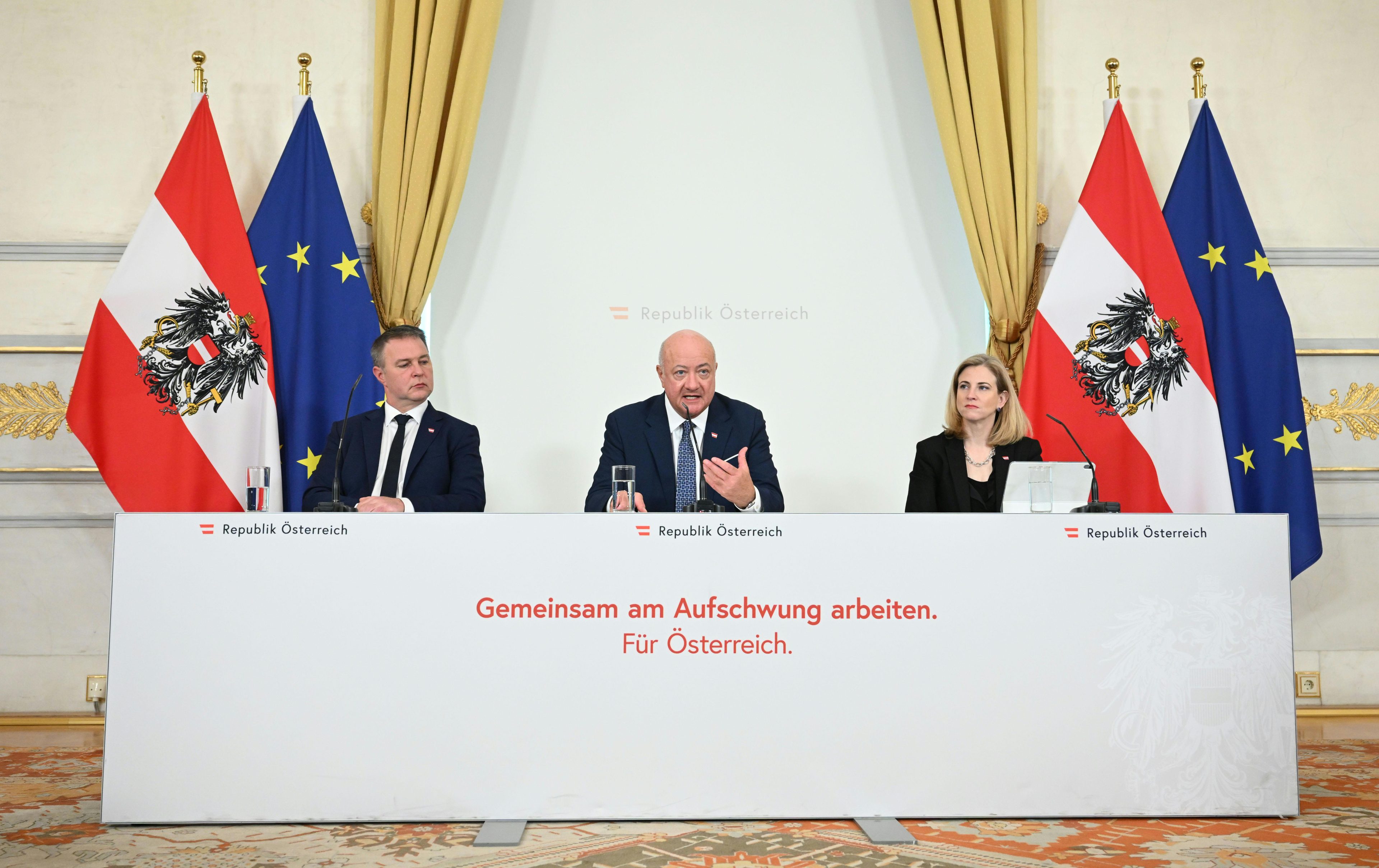 Vizekanzler Andreas Babler (SPÖ), Bundeskanzler Christian Stocker (ÖVP) und Außenministerin Beate Meinl-Reisinger (NEOS) am Mittwoch, 18. März 2026, anl. einer Sitzung des Ministerrats im Bundeskanzleramt in Wien.APA/HELMUT FOHRINGER