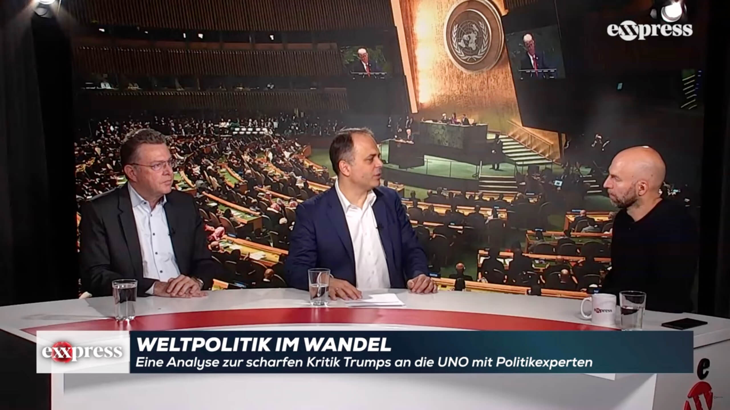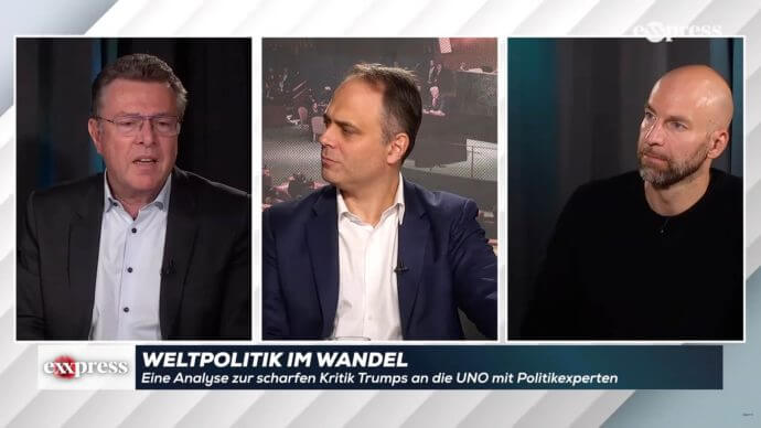 Harte Analyse im exxpress-Studio: Herbert Scheibner (l.), Stefan Beig (M.) und Ralph Schöllhammer (r.) über Trumps Abrechnung mit der UNO.EXXPRESS/EXXPRESS
