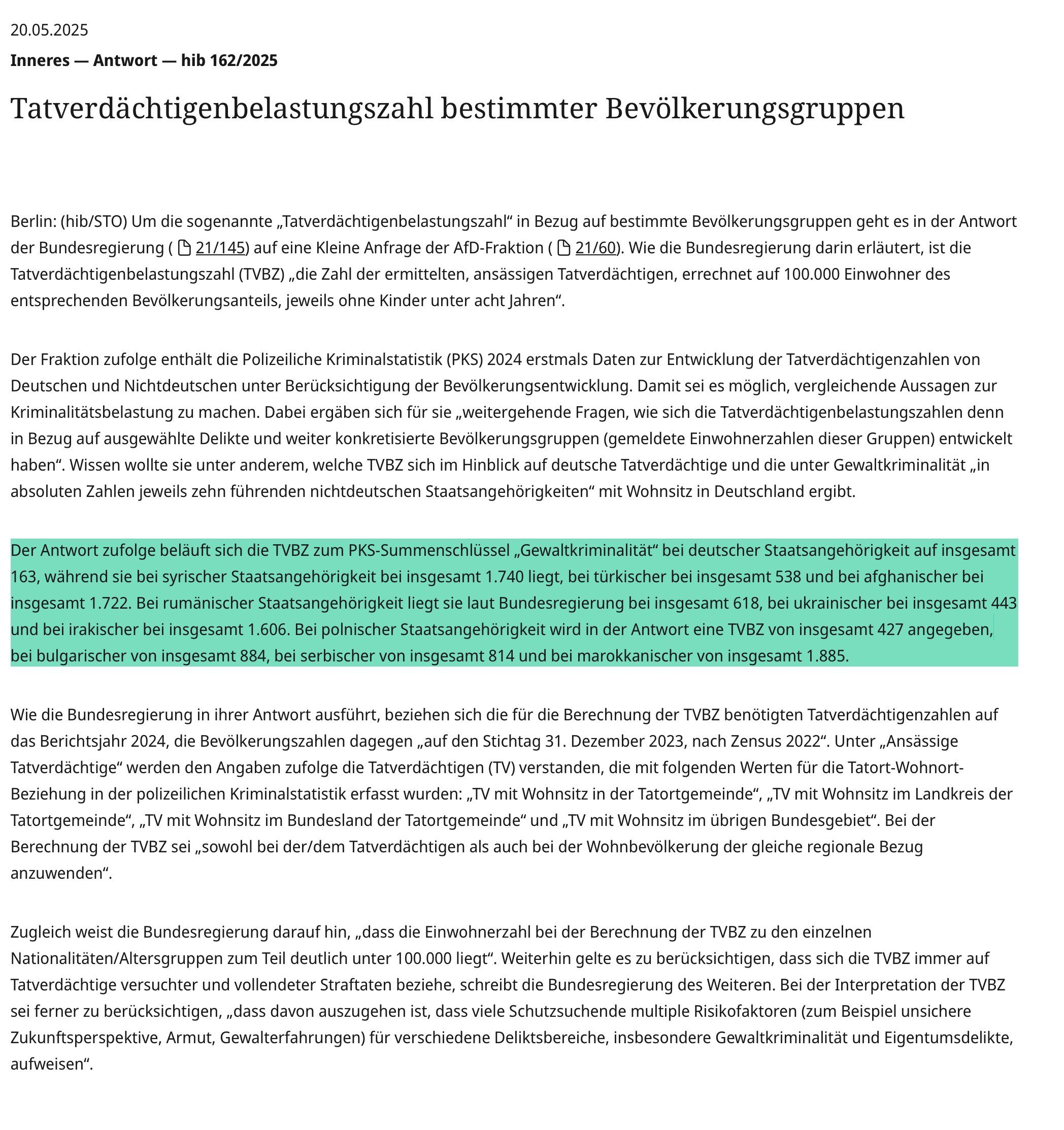 Wie die Anfragebeantwortung der Bundesregierung auf die Anfrage der AFD zeigt, lag die sogenannte Tatverdächtigenbelastungszahl (TVBZ) im Jahr 2024 bei Syrern bei 1.740, bei Afghanen bei 1.722 und bei Irakern bei 1.606.