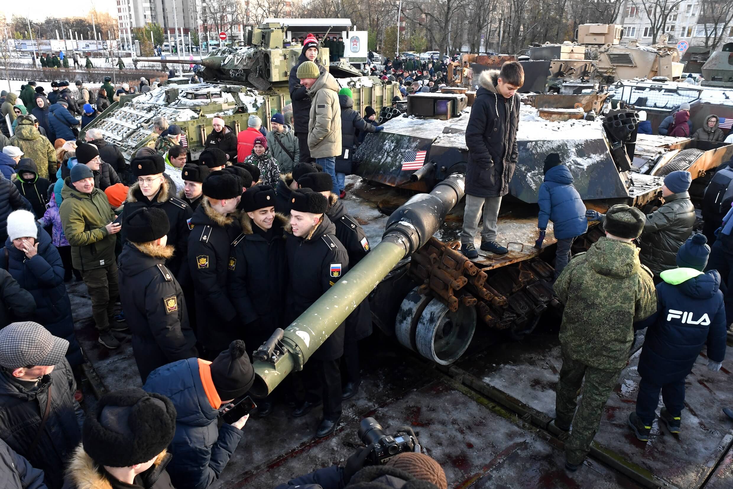 Zur Schau gestelltes Scheitern: Russische Kadetten und Kinder posieren auf einem zerstörten US-Abrams-Panzer in Moskau. Das Symbol amerikanischer Militärmacht wird zur Trophäe.APA/AFP/Olga MALTSEVA