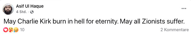 Ein Islamist erklärte: „Möge Charlie Kirk für alle Ewigkeit in der Hölle schmoren. Mögen alle Zionisten leiden.“