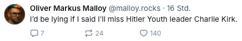 Ein anderer meinte: „Ich würde lügen, wenn ich sagen würde, dass ich Charlie Kirk, den Anführer der Hitlerjugend, vermissen werde.“