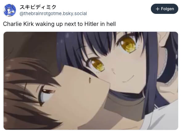 Manche linke Social Media Nutzer der Generation Z freuten sich offen über Kirks Tod und deuteten an, dass er zusammen mit Jeffrey Epstein in der Hölle „braten“ würde. Auf TikTok teilen Linke Videos von sich beim Lachen und Tanzen. Ein Beitrag zeigt einen Ausschnitt aus einer Fernsehsendung mit der Bildunterschrift: „Hitler führt Charlie Kirk durch die Hölle.“ Ein anderer Beitrag machte eine ähnliche Andeutung und behauptete, der verstorbene Vater von zwei Kindern würde neben Hitler in der Hölle aufwachen.
