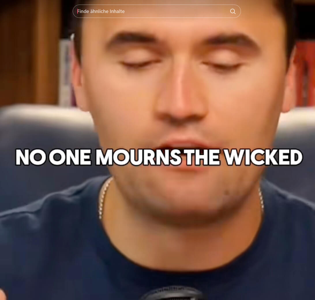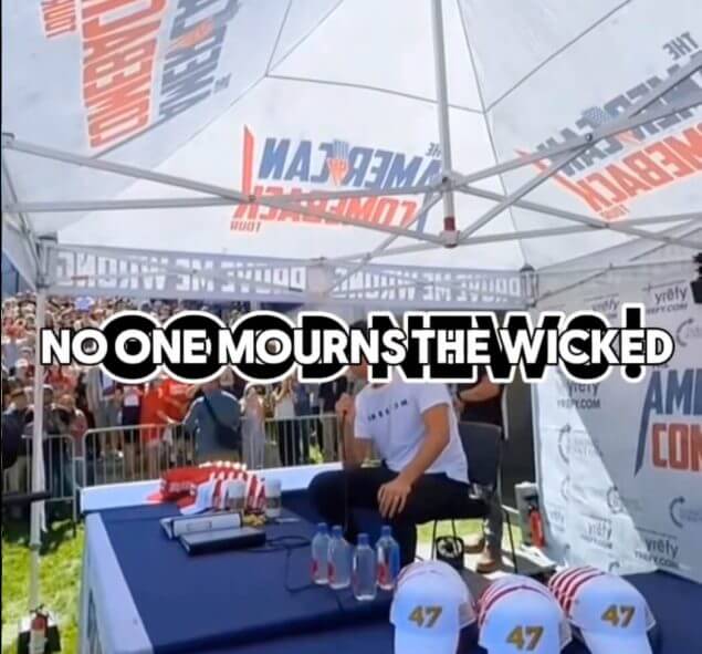 Ein weiteres Video mit einem Text, der Kirks Tod verkündete, zeigte eine Frau, die zu einem Song aus Wicked lippensynchron mitsang und dabei die Worte „Niemand trauert um die Bösen“ formte – ein Slogan der zurzeit auf TikTok unter Kirk-Hassern viral geht.