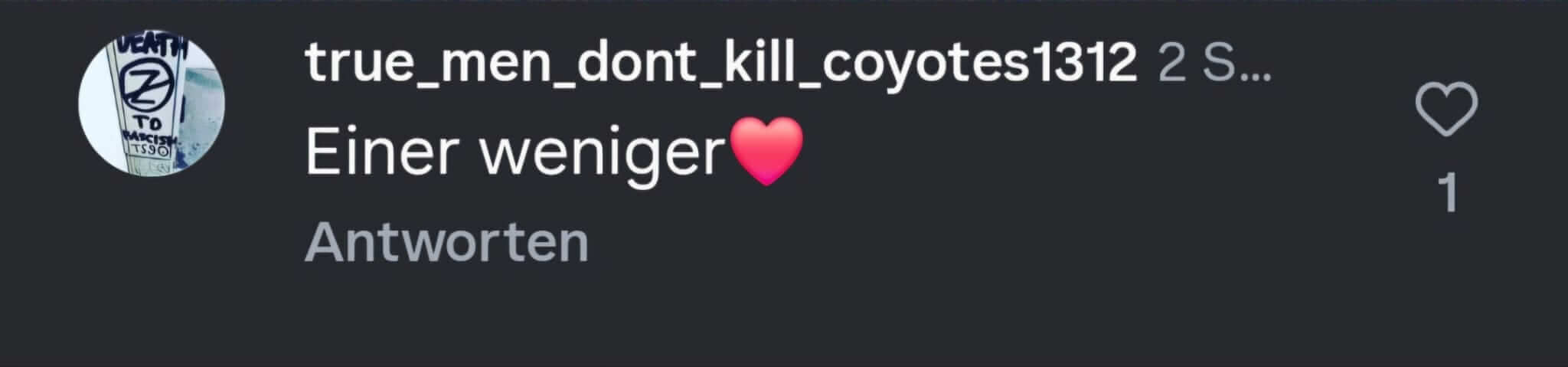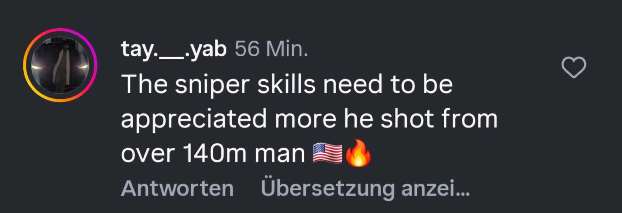 Auch auf Instagram äußern sich mehrere Nutzer mit verstörenden Kommentaren. Einer schreibt beispielsweise „satisfaction“ (Englisch für „Zufriedenheit“), ein anderer „Gut“ mit einem Daumen-hoch-Emoji, und ein weiterer kommentiert „Einer weniger“ mit einem roten Herz. Besonders abscheulich: Ein amerikanischer Instagram-Nutzer bedankt sich sogar bei dem Scharfschützen und rühmt dessen „Leistung“.