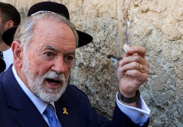 US-Botschafter Mike Huckabee hält einen Zettel von US-Präsident Donald Trump in der Hand, um ihn in die Ritzen der Klagemauer zu stecken – der heiligsten Stätte, an der Juden beten dürfen.APA/AFP/GIL COHEN-MAGEN